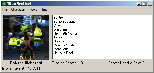 Tracking BadgesBadges can be tracked in two ways: from the Chat window and from the Personal Info window. If the user has the Rewards chat channel in any in-game chat tab, Badges can be detected as soon as they are earned by analyzing the messages sent from the game server. Tracking Badges from the System chat channel, which was used in the past by assigning the character's Badge title, is not supported because the method is deprecated in favor of the following: Opening the Personal Info window will allow all of the character's owned badges to be detected. This window can be accessed from the main menu, by typing the /info_self slash command into the game's chat window, or by using the /info slash command while nothing is targeted. Badges Needing /infoSome Badges cannot be reliably tracked from the Rewards channel and require the Personal Info window to properly resolve. If any such Badge titles are encountered, a message will appear in the bottom-right corner of this view to indicate to the user that the Personal Info window needs to be loaded to accurately track all of the character's badges. |